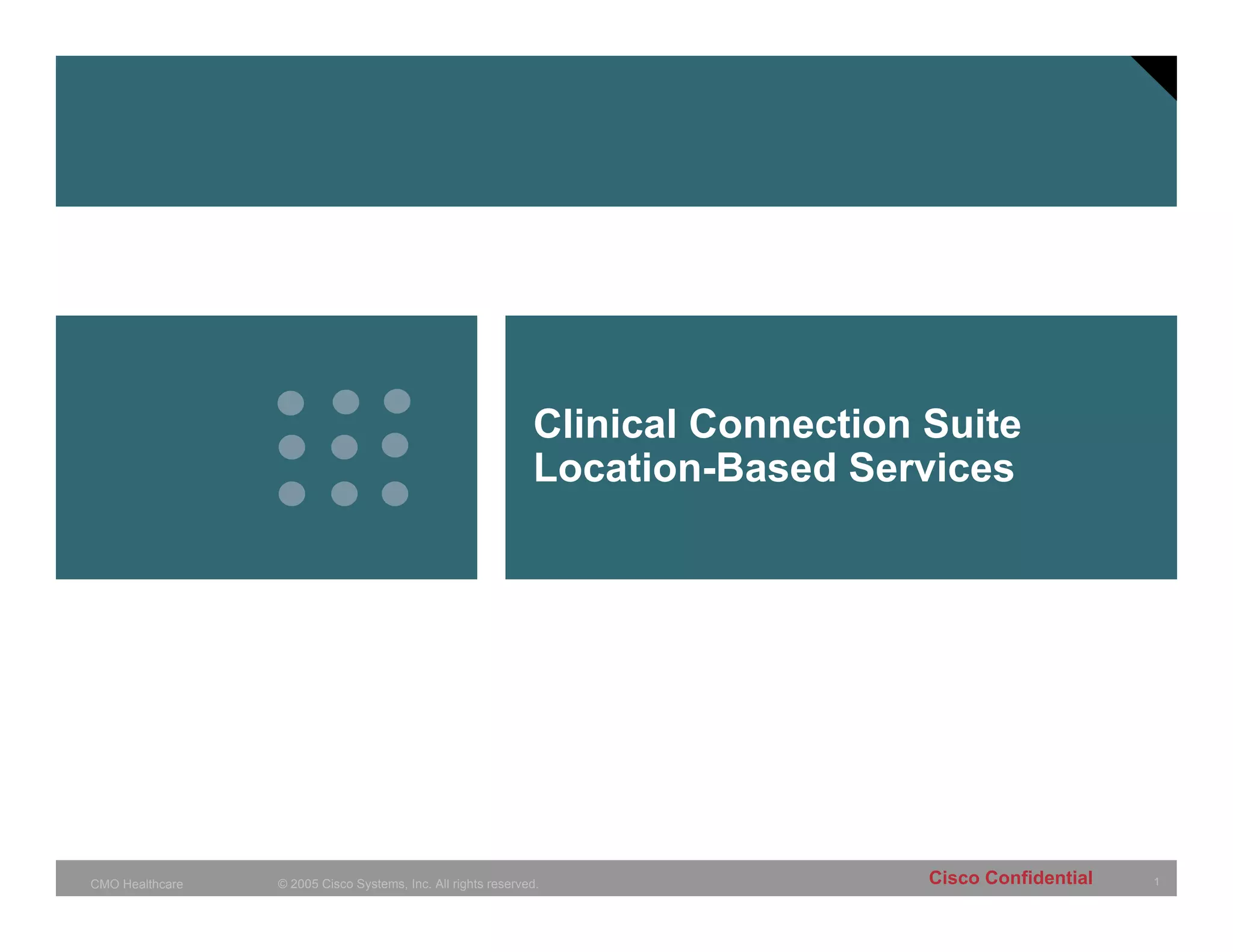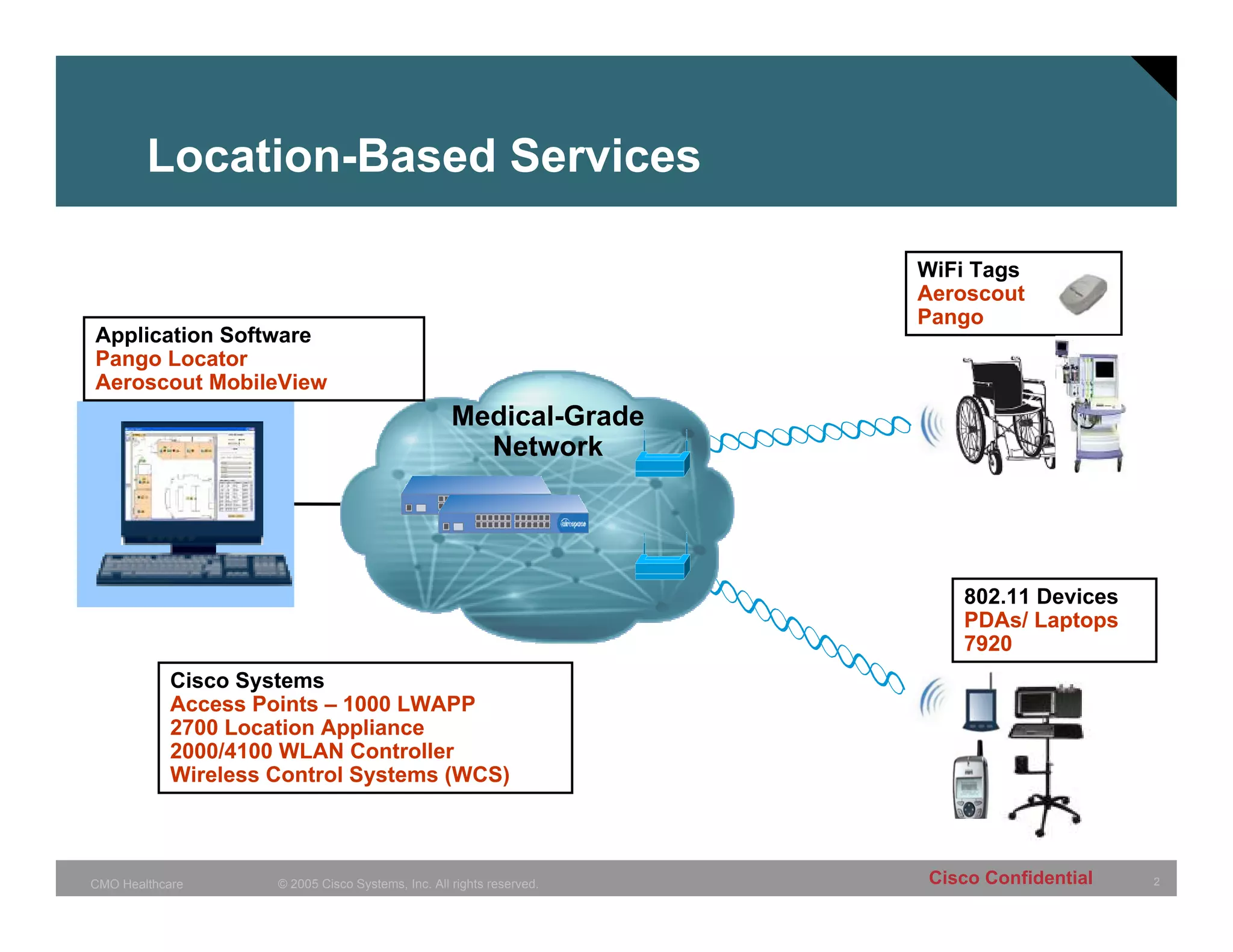 This document describes a location-based services solution using Cisco's wireless network infrastructure and partnerships with Aeroscout and Pango. The solution utilizes Cisco's wireless LAN controllers and access points along with location appliances and software to track WiFi tags and mobile devices in real-time. Partner applications like Aeroscout MobileView and Pango Locator are used to visualize location data and configure alerts. The solution provides centrally managed or distributed wireless LAN options with scalability and integrations for healthcare location-based services.