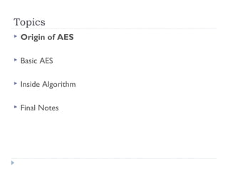 The document discusses the Advanced Encryption Standard (AES), which was selected by the U.S. National Institute of Standards and Technology in 2000 to replace the older Data Encryption Standard (DES). It describes the origins and development of AES, including the evaluation process where Rijndael was selected as the winning algorithm. The summary also provides a high-level overview of how AES works, including its conceptual scheme, encryption rounds, key scheduling, and security against known attacks.