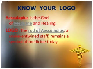 The document provides an introduction and overview of Aesculapius Hospital. It discusses the hospital's logo, vision, mission, core values, specialties, and continuous quest for excellence in healthcare delivery. It also outlines the hospital's open-door policy, equal employment opportunities, code of ethical conduct, and performance review process. The hospital aims to provide affordable, quality healthcare while maintaining high standards of patient care, expertise, and research.