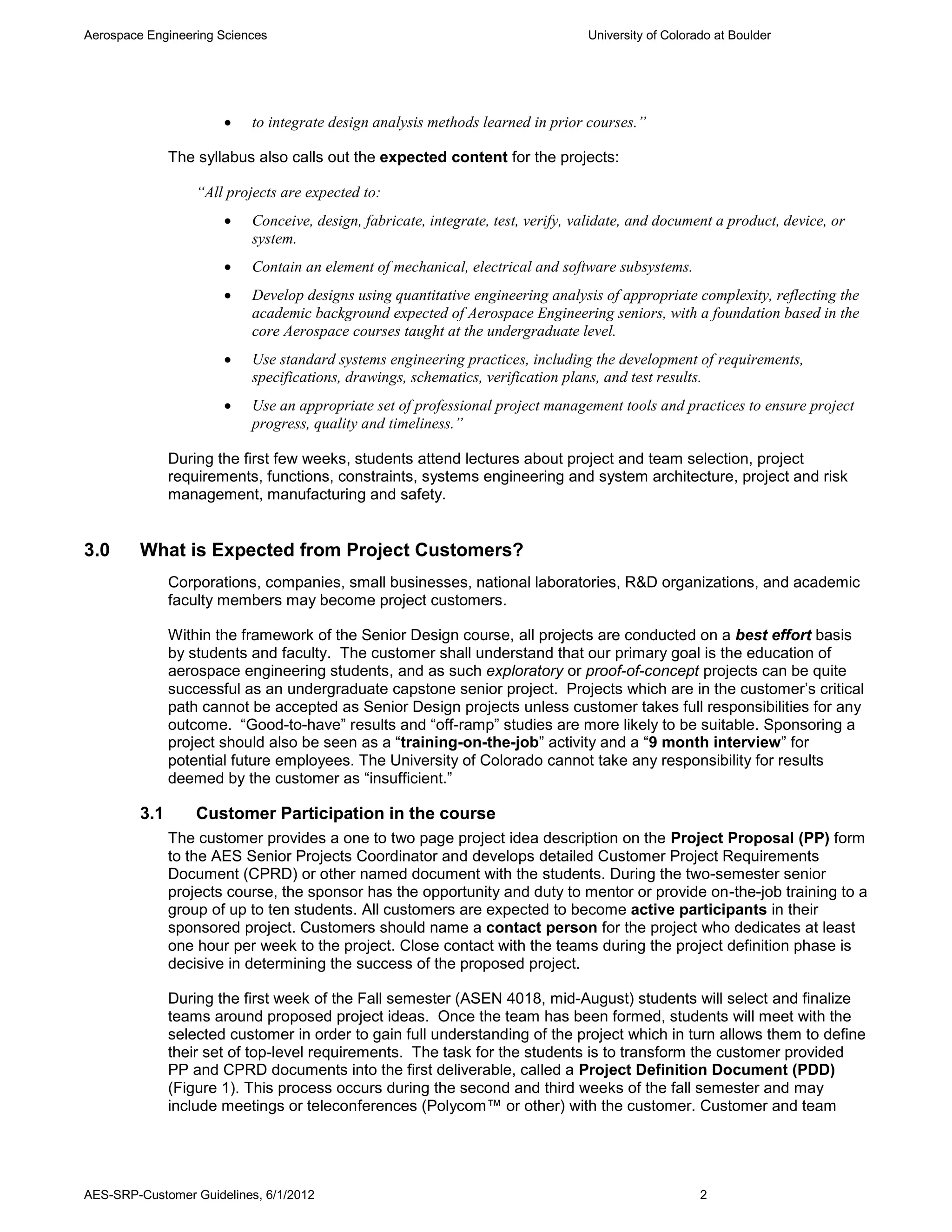This document provides guidelines for customers sponsoring senior design projects for aerospace engineering students at the University of Colorado Boulder. It outlines the course structure and content, expectations for customer participation and support, and deliverables that will be provided to customers. Customers are asked to commit a minimum of $20,000 for "Minimum Support" projects or $35,000 for "Customer Ownership" projects to cover project costs and department resources. In return, customers receive mentorship opportunities and all student work including final reports and presentations. The goal is to provide students with a meaningful, real-world design experience while obtaining valuable customer input and deliverables.