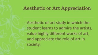 This document discusses aesthetic appreciation and art analysis. It defines aesthetic appreciation as admiring artists and valuing different works of art. It then outlines three main aesthetic theories: imitationalism which focuses on realistic representation, formalism which examines artistic form, and emotionalism which considers the emotions conveyed. The document also discusses several art movements like Impressionism and Cubism. It concludes with a four step process for art appreciation: description, analysis, interpretation, and judgment.