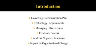 The document outlines a healthcare organization's communication plan aimed at improving patient and employee security while enhancing medical care. It emphasizes the need for stakeholder engagement, feedback processes, and effective communication strategies for managing organizational change and ensuring safety. Key goals include reducing security occurrences, implementing advanced technology, and fostering employee participation in the change process.