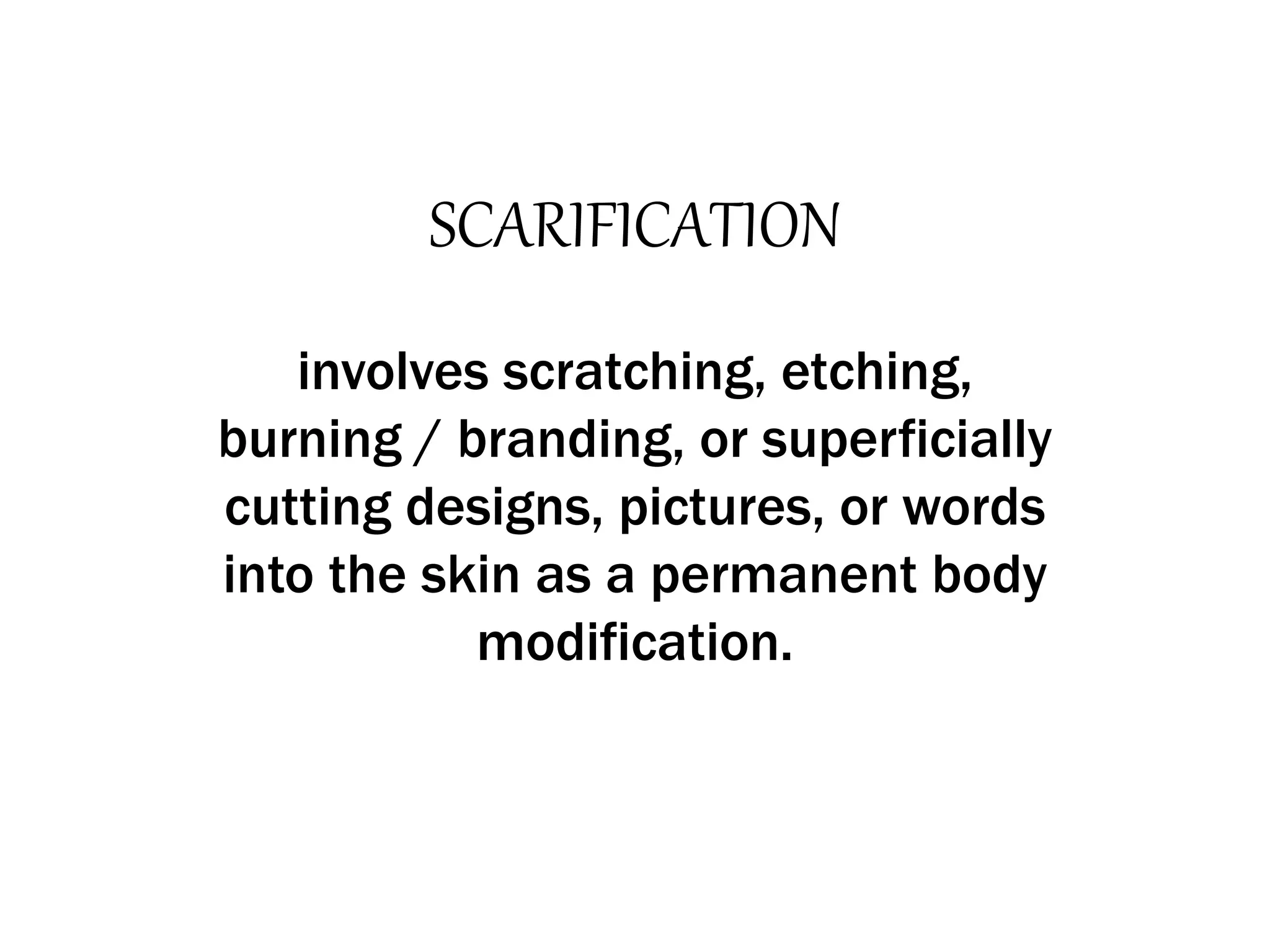 Scarification involves deliberately cutting or burning designs, pictures, or words into the skin for permanent body modification. It is an ancient practice used in rituals and rites of passage to transmit messages about identity, social roles, and inclusion in a group. Ink or color can be rubbed into fresh cuts to add color and have a similar effect to tattoos. Reasons for scarification include marking puberty, marriage, and emphasizing social and religious roles.
