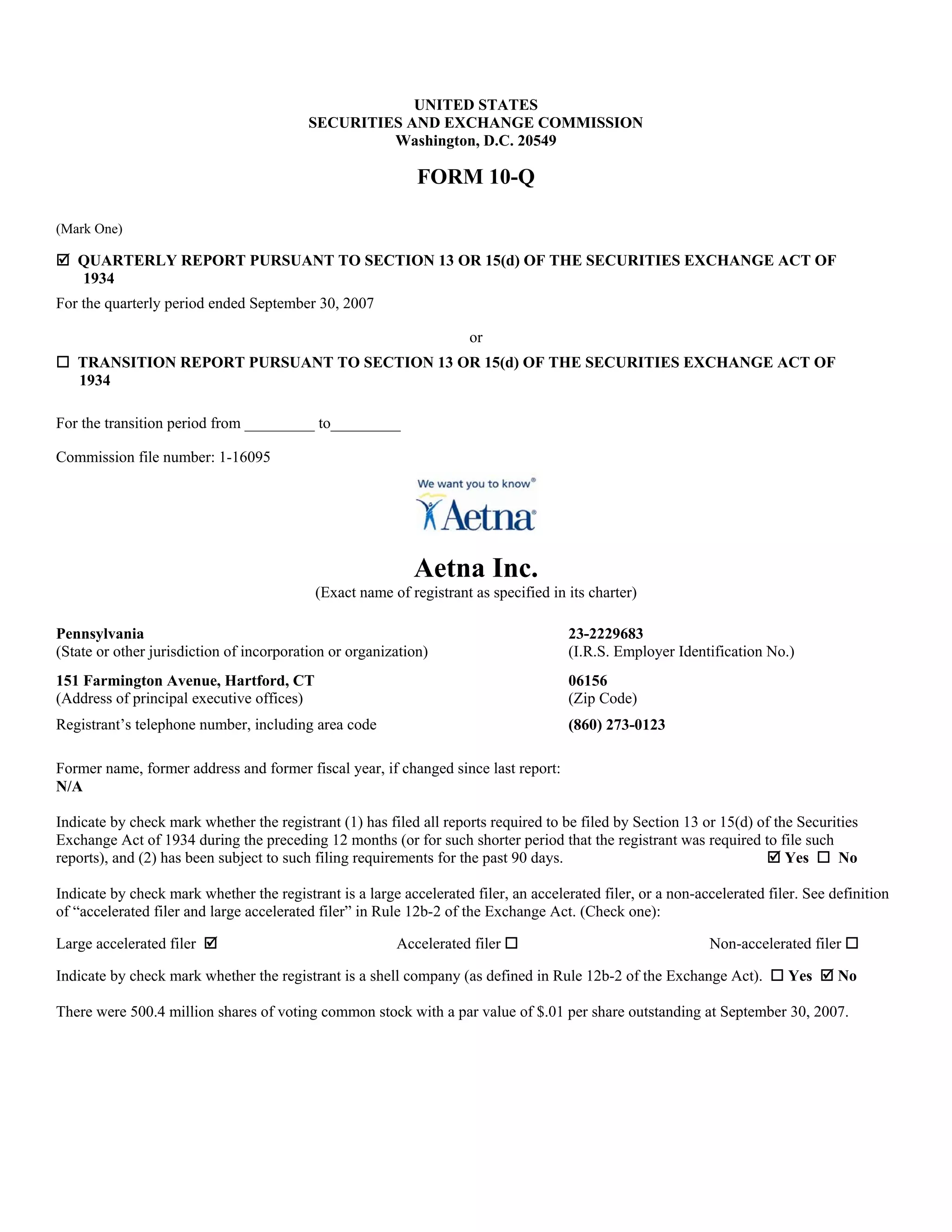 This document is a quarterly report filed by Aetna Inc. with the Securities and Exchange Commission for the quarterly period ended September 30, 2007. It includes Aetna's consolidated financial statements and notes. The financial statements show that for the quarter, Aetna reported total revenue of $6.96 billion, income from continuing operations of $496.7 million, and net income of $496.7 million. For the nine months ended September 30, 2007, Aetna reported total revenue of $20.46 billion, income from continuing operations of $1.38 billion, and net income of $1.38 billion. The balance sheet shows total assets of $50.06 billion and total liabilities