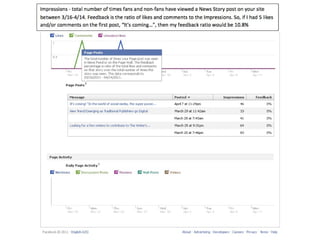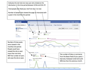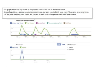 - Specific recommendations include posting at certain times of day, using relevant keywords, asking questions to engage customers, and analyzing insights and analytics to improve content. The document also covers using video, search engine optimization strategies, and ways to encourage more people to like a business's Facebook page.