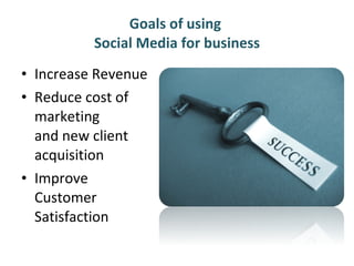 - The document discusses strategies for using Facebook effectively for business purposes such as increasing revenue, reducing marketing costs, and improving customer satisfaction. It provides tips for listening to customers, engaging customers, creating quality content, and measuring business metrics on Facebook.