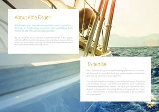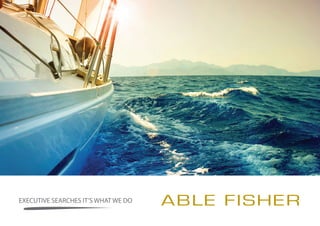Able Fisher is an international executive search firm specializing in recruiting executives for law firms, banks, and corporations. They focus on finding global leaders with outstanding track records who can create value for clients. Able Fisher has extensive expertise across industries and functional areas. They deliver a bespoke service and aim to build long-term relationships with both clients and candidates.