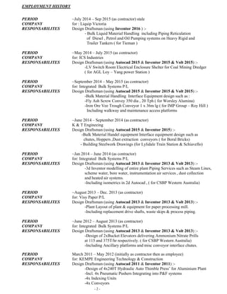 This technical resume summarizes the qualifications and experience of Adrian Farfaglia in mechanical engineering design, drafting, project management, and construction. It details his 46 years of experience working as a contractor for various manufacturing companies, with responsibilities including design, drafting, project management, and on-site commissioning. His areas of expertise include bulk material handling systems, automation equipment, heavy machinery, tooling, and residential construction. The resume lists his education and training in mechanical design, engineering, and construction. It provides employment history from 1989 to the present, describing his roles and responsibilities on various projects for companies in various industries.
