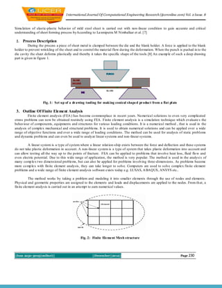 This document discusses the finite element simulation of the deep drawing process for a conical component made from mild steel. The study utilizes ANSYS software to analyze stress distribution in the drawn parts, focusing on two models with varying thicknesses. The findings aim to assist tool designers and manufacturers by providing insights into optimizing the deep drawing process.