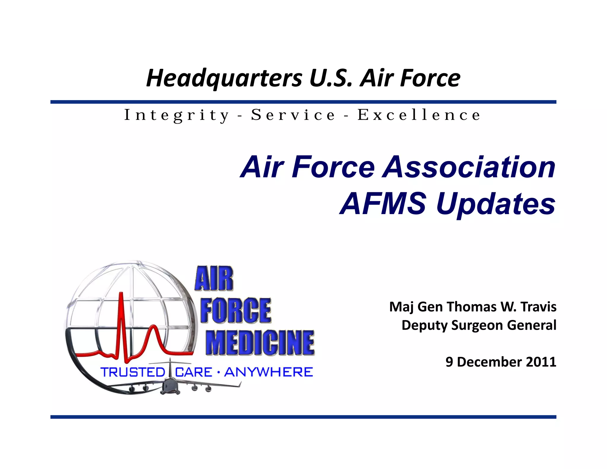 The document provides an overview of recent successes and hot topics within the U.S. Air Force Medical Service (AFMS). It discusses major transformational initiatives including the establishment of Emergency Medical Deployment Systems Health Response Teams. It also covers hot topics such as initiatives to increase resiliency and address suicide, traumatic brain injuries, and changes to military health structure and benefits. Accomplishments are highlighted relating to enhanced casualty care, implementation of patient-centered medical homes, and investments in education, training, and research.