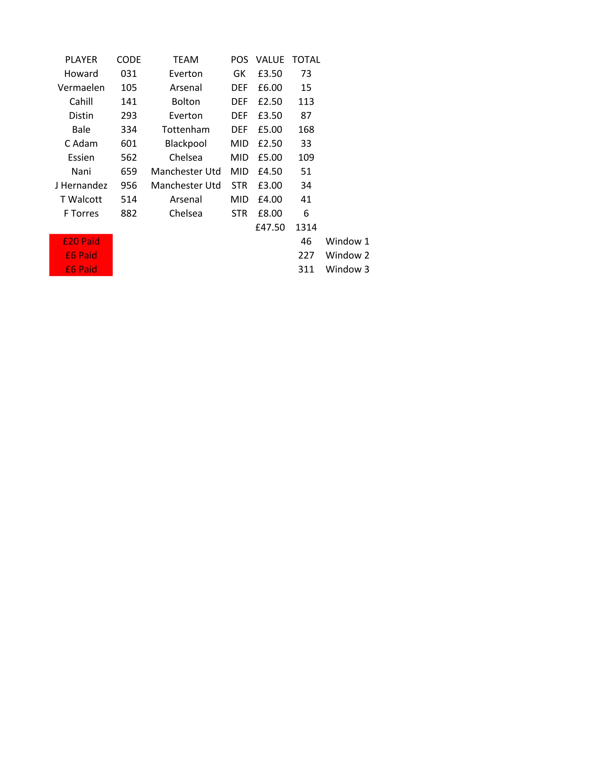 This document contains a table listing soccer players with their player code, team, position, value, and total points scored. It shows Howard as the goalkeeper for Everton with a value of £3.50 and 73 total points. It also lists transfers made during the first 3 windows totaling £32 and points of 584.