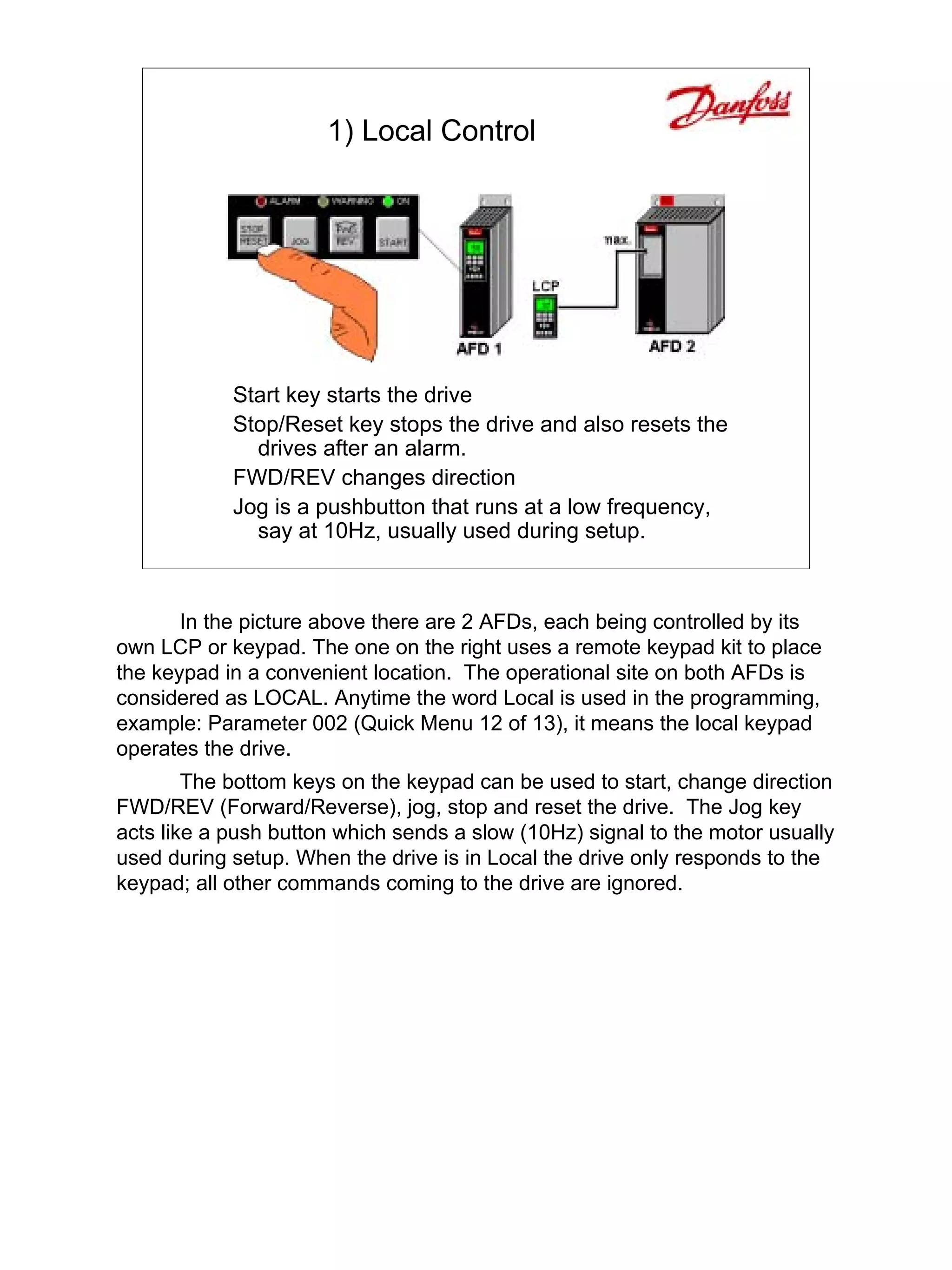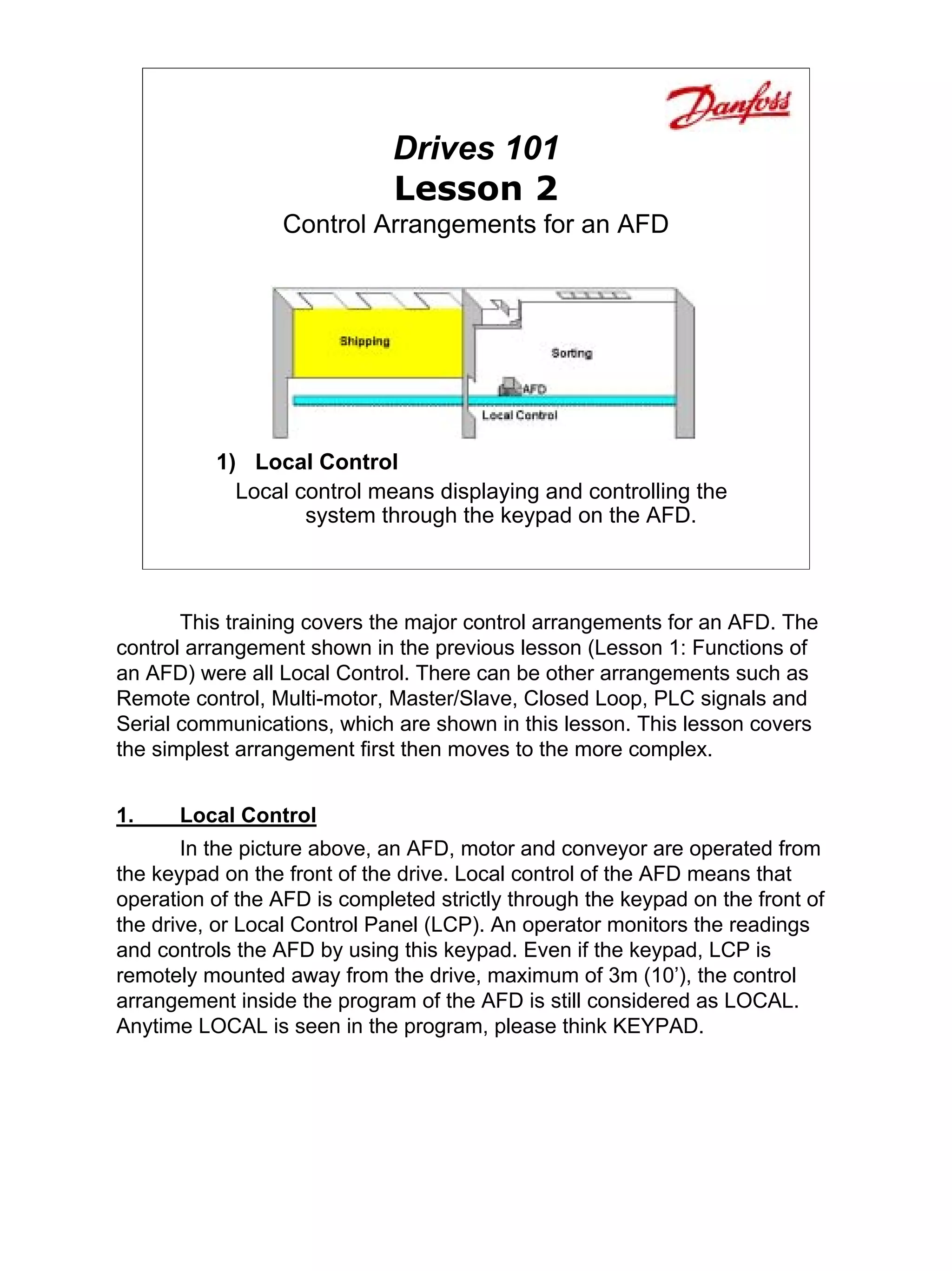 This document discusses various control arrangements for an adjustable frequency drive (AFD). It begins by covering local control, where the AFD is operated through a keypad on the front of the drive. It then discusses more complex arrangements such as remote control using signals wired to the control section, multi-motor operation using a single AFD to control multiple motors, master-slave configuration where a lead AFD sends control signals to following AFDs, and closed loop control where a speed command is sent as a reference and encoders provide feedback. The document provides examples and explanations of features for each control arrangement type.