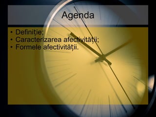 Afectivitatea se referă la trăirile și emoțiile generate de interacțiunile între stările interne ale subiectului și factorii externi, având forme diferite precum dispozițiile, emoțiile, sentimentele, afectele și pasiunile. Dispozițiile reprezintă stări afective de intensitate medie, emoțiile au o orientare specifică și o caracteristică situativă, iar pasiunile sunt trăiri intense și stabile care influențează personalitatea. Afectele, cum ar fi frica și mânia, sunt izbucniri puternice dar de scurtă durată, în contrast cu sentimentele persistente care asigură constanța atitudinii afective.