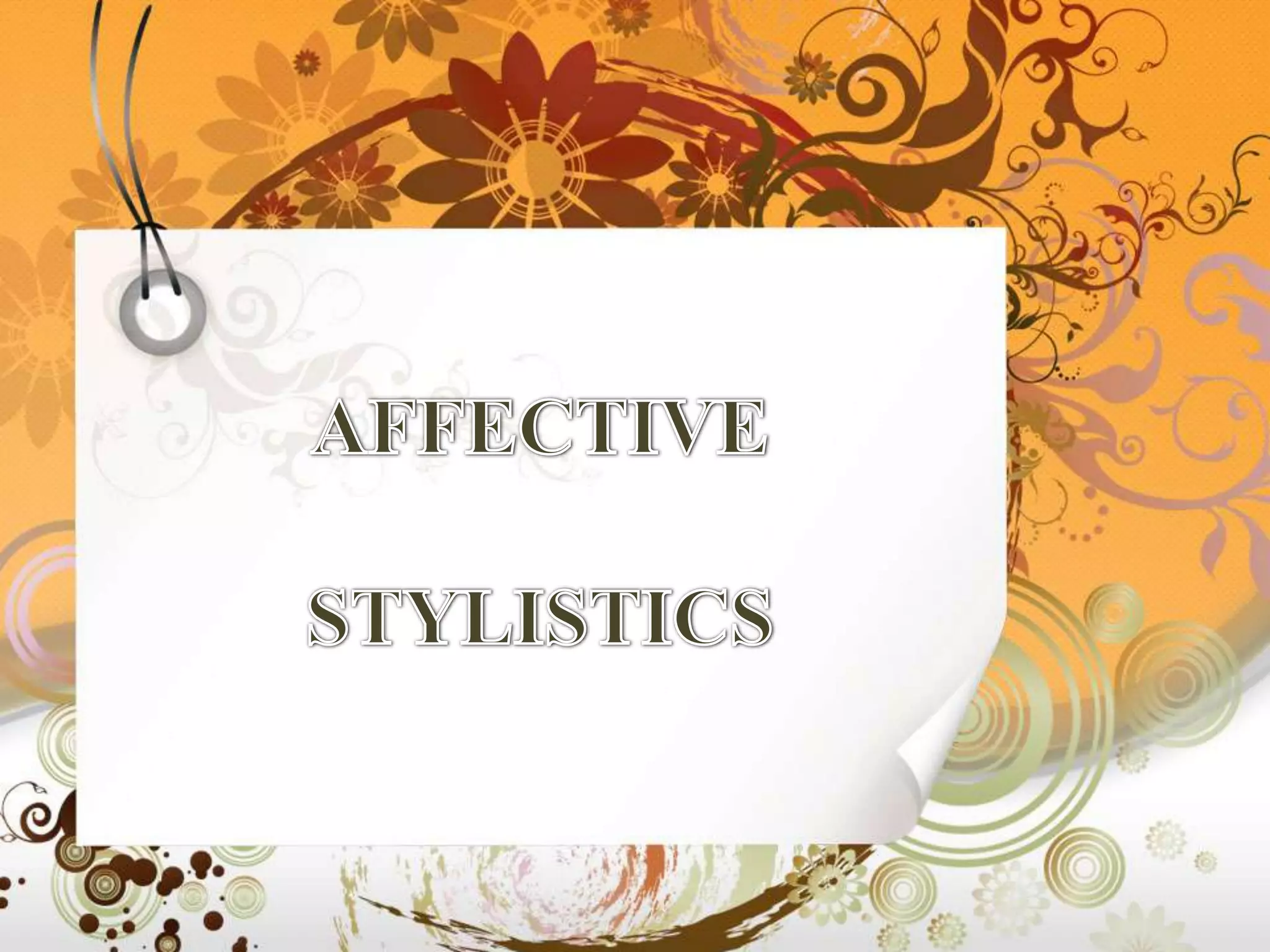 Affective stylistics examines how a text affects the reader during the reading process, rather than viewing the text as a static object. It involves close analysis of the text, often word-by-word, to understand how it structures the reader's response moment to moment. While the text is the focus, affective stylistics sees meaning as arising from the reader's experience rather than being inherent to the text itself. It aims to study how the reader engages with the text and makes sense of it during the reading process.