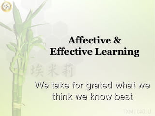 This document discusses affective teaching and learning. It emphasizes that teachers should focus on students' beliefs, attitudes, and motivation. After an unsuccessful class, teachers should reflect rather than blame students. The document provides ideas to make learning more affective, such as involving movement, emotions, and cognitive activities. It stresses varying activities, challenging students, and explicitly discussing learning goals and benefits. Teachers should create a safe environment where students feel comfortable making mistakes and learning from them. The overall focus is on developing students' self-beliefs, beliefs about learning, and positive attitudes.