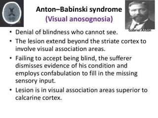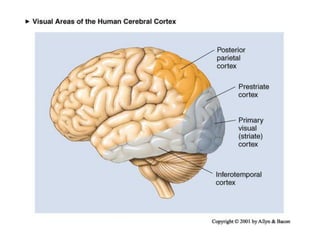 The document outlines the anatomy and functionality of the afferent visual pathway, detailing the structures involved from the retina to the visual cortex, including the optic nerve, optic chiasm, and lateral geniculate nucleus. It also discusses the types of visual field defects related to lesions in the visual pathway and introduces concepts like monocular and binocular vision, different types of photoreceptors, and visual processing streams. Lastly, it highlights various disorders connected to the visual pathway, including visual agnosia and color perception deficits.