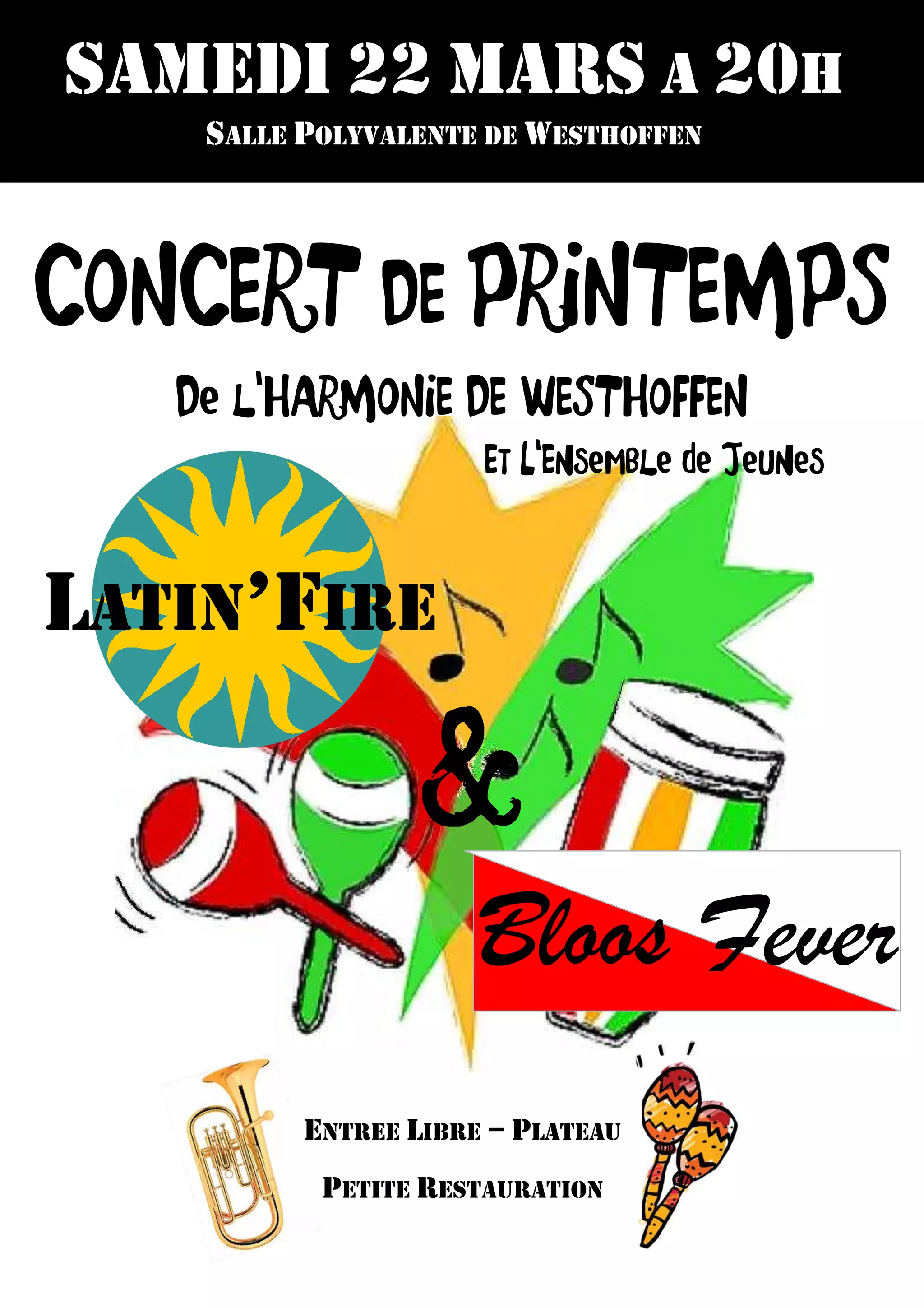The document announces a spring concert by the Harmonie de Westhoffen and Ensemble de Jeunes on March 28, 2020 in the Westhoffen multipurpose hall. A small reception will be offered. The concert will feature the Bloos Fever band.