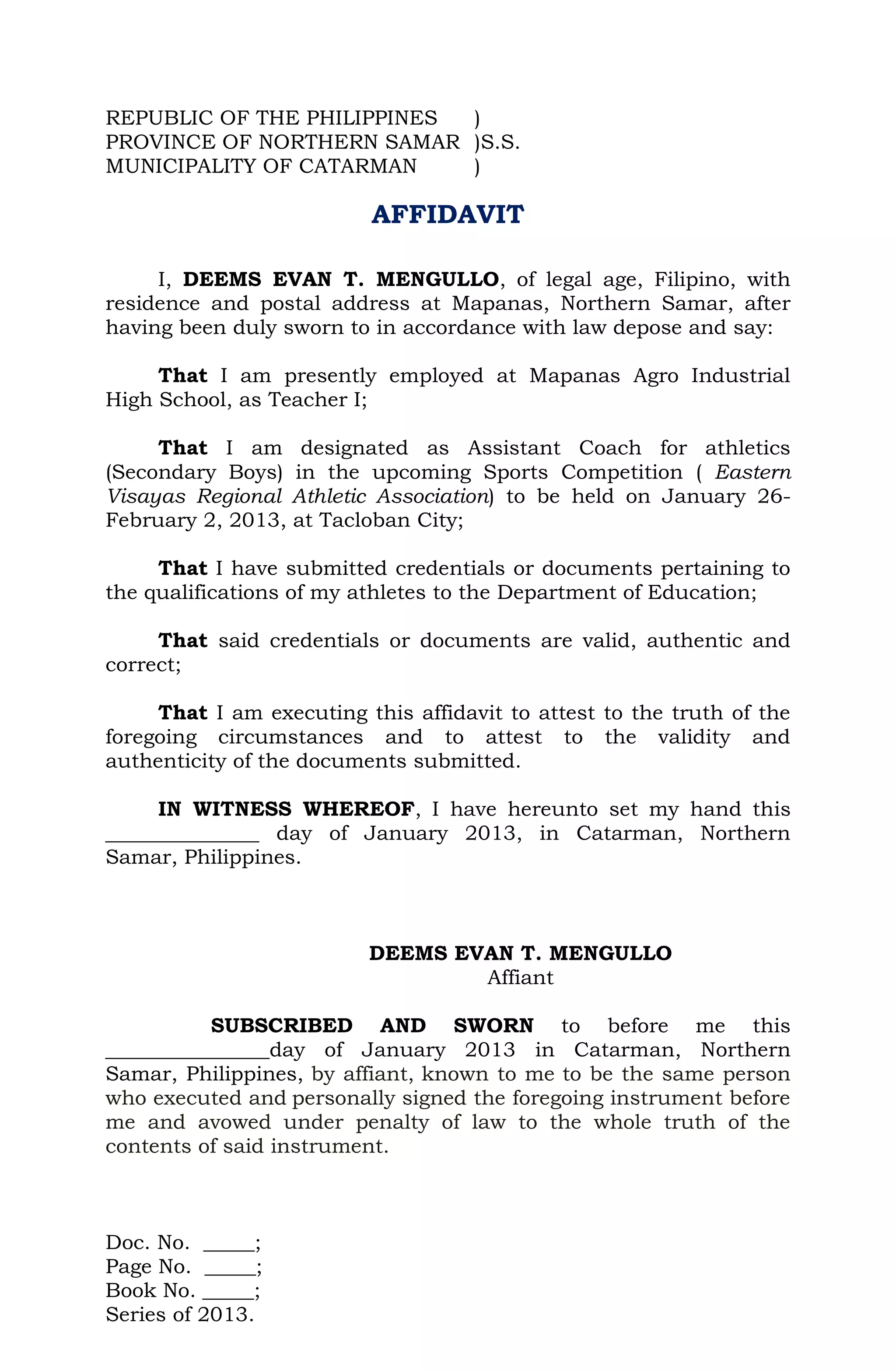 Deems Evan T. Mengullo, a teacher at Mapanas Agro Industrial High School, swore in an affidavit that he is the assistant coach for the school's boys' athletics team competing in an upcoming regional competition from January 26-February 2, 2013 in Tacloban City. He affirmed that he submitted valid and authentic credentials for his athletes to the Department of Education. Mengullo signed the affidavit to attest to the truth and validity of the information provided.