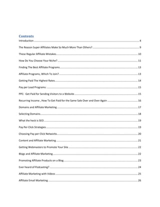 The document discusses the fundamentals and strategies of affiliate marketing, emphasizing that super affiliates succeed through innovation, dedication, and understanding their market. It outlines the importance of selecting the right programs, engaging with customers, utilizing varied media for promotions, and analyzing performance metrics. Additionally, it warns of potential challenges in the affiliate journey and highlights key traits of successful marketers, suggesting that time commitment and a willingness to invest in one's business are crucial for success.