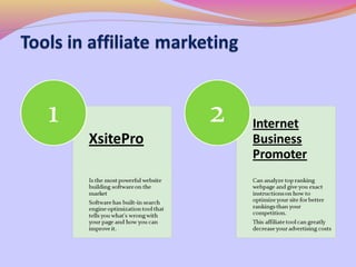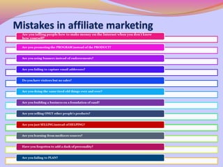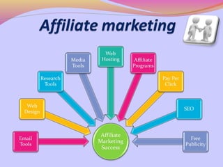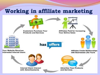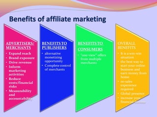 The document discusses affiliate marketing, defined as the promotion of merchants' products by affiliates through their websites, and emphasizes its benefits and potential for generating customers and revenue. It details recent trends in affiliate marketing, such as higher keyword prices and the integration of paid search with enterprises. Additionally, it highlights the importance of a flexible mindset for success in affiliate marketing as well as companies involved in this field.
