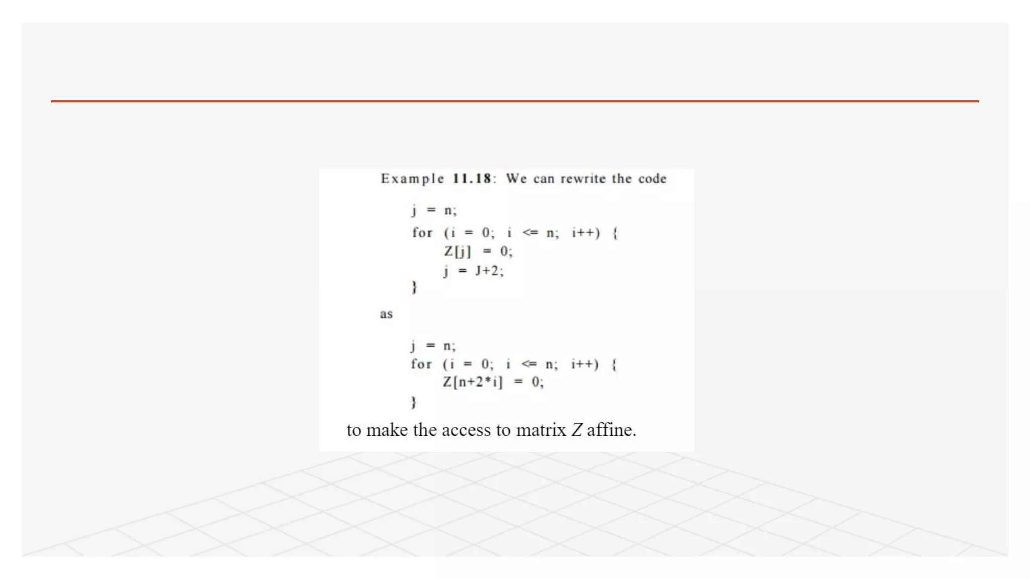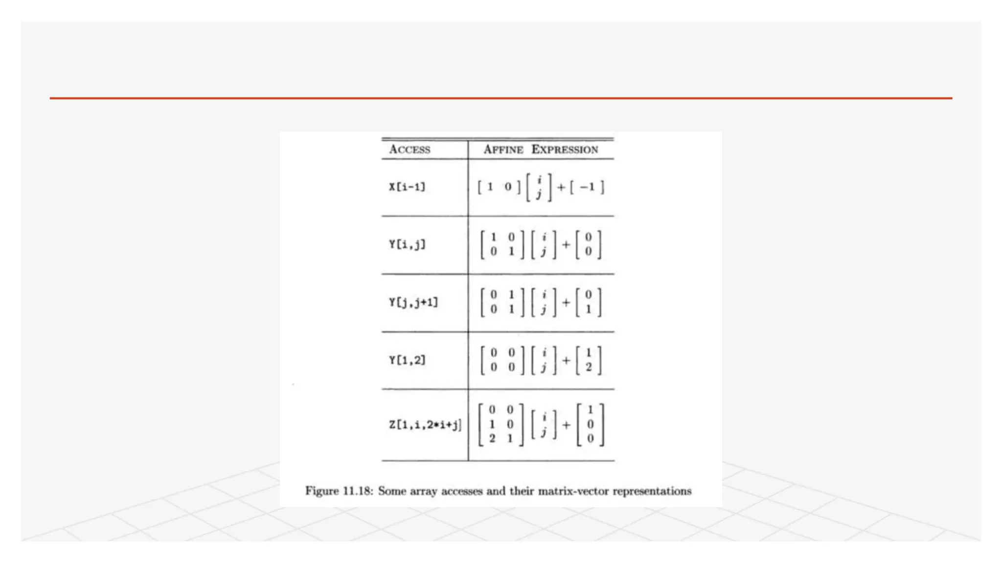 This document discusses affine array accesses in compiler design. It defines an affine access as one where the array index is expressed as an affine expression of loop indexes and constants. Affine accesses can be represented as a matrix-vector calculation that maps the iteration space to data space. Examples are given of affine accesses and how they can be written as tuples representing the mapping between indexes and array elements. Non-affine accesses are also discussed, such as those involving sparse matrices. Exercises are provided to represent given array accesses as affine tuples.