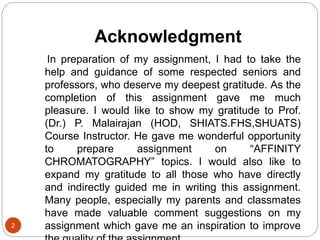 Affinity chromatography is a technique that separates proteins based on a reversible interaction between a protein and a ligand coupled to a chromatography matrix. It offers high selectivity and purification. The document discusses the definition, principles, components, steps, applications, advantages and disadvantages of affinity chromatography. Key terms like matrix, spacer arm, ligand, binding, elution and wash are explained. Common applications include immunoglobulin purification, recombinant tagged proteins, and separation of enzyme substrates. Advantages are high specificity and yield, while disadvantages include time consumption and solvent use.