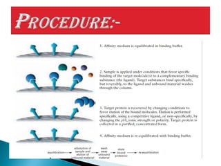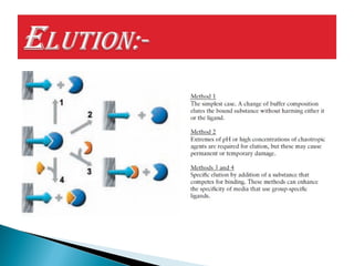 Affinity chromatography is a specialized technique within chromatography that utilizes specific binding interactions between a target substance and a ligand for the purpose of separation and purification. Key components include a chemically inert matrix for ligand attachment, various types of ligands for different target molecules, and specific methods for achieving high selectivity and yield in purification. Despite its advantages, challenges such as non-specific adsorption and high costs of immobilized ligands exist.