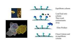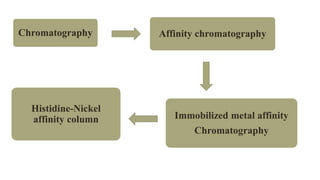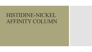 The document discusses histidine-nickel affinity chromatography, a method for separating proteins based on their reversible interaction with ligands on a chromatography matrix. It details the characteristics of an ideal matrix, the role of ligands and spacer arms, and outlines practical procedures for protein purification. The use of immobilized metal affinity chromatography with histidine residues is emphasized for its efficiency in purifying tagged proteins.