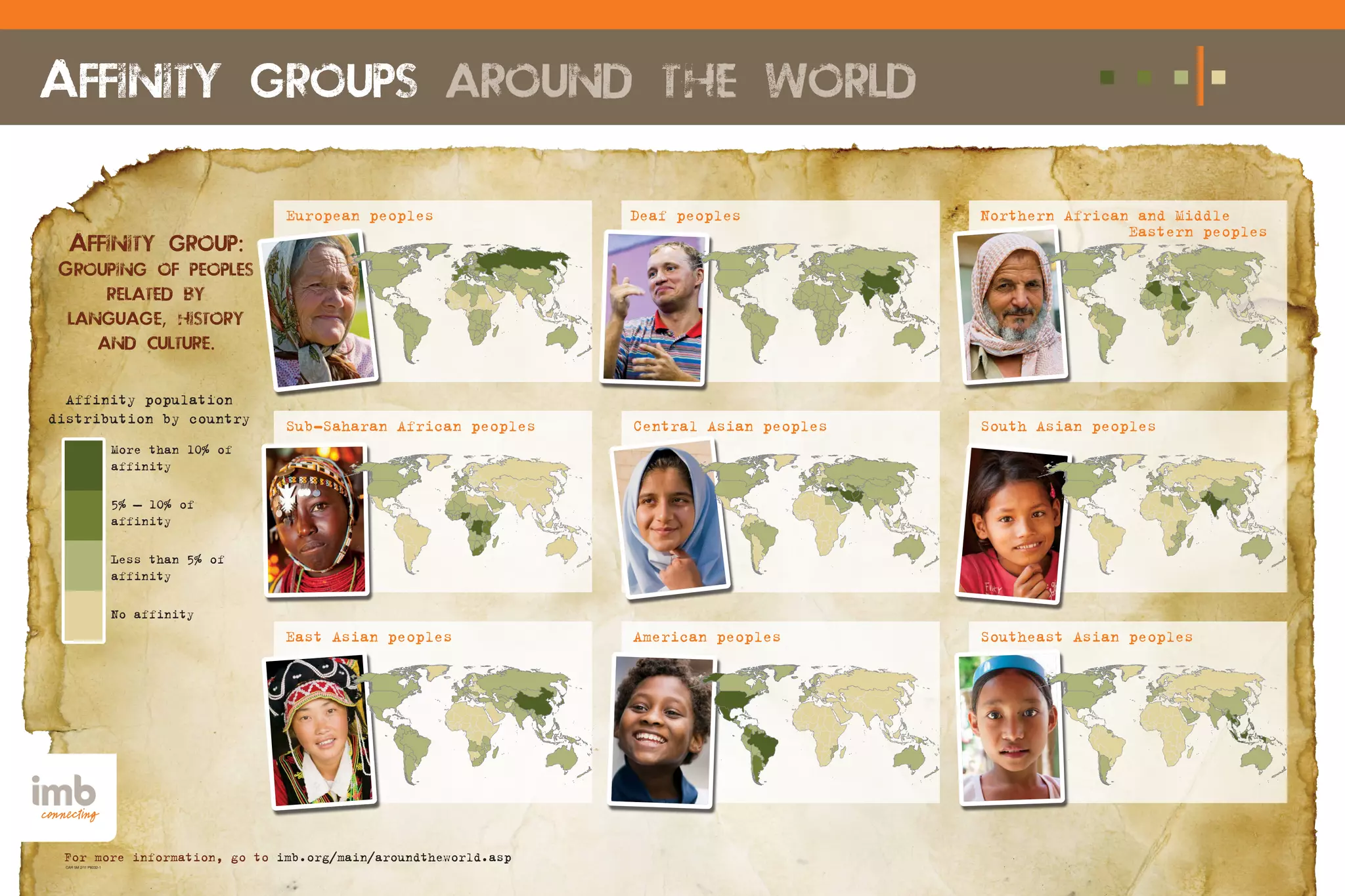 This document provides a chart showing the distribution of different affinity groups around the world. Affinity groups are groupings of peoples related by language, history, and culture. The chart shows the percentage of each affinity group's population located in different countries, with designations for countries containing more than 10%, 5-10%, less than 5%, or no population of a given affinity group.