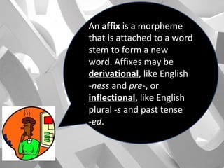 This document discusses prefixes and suffixes. It provides lists of common prefixes and suffixes used in English, along with their meanings and examples. Prefixes are added to the beginning of words to modify their meaning, while suffixes are added to the end. Some examples provided are the prefix "pre-" meaning before, and the suffix "-ly" used to form adverbs.