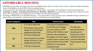 The document discusses the state of affordable housing in India, highlighting the challenges posed by urbanization, regulatory constraints, and high construction costs that contribute to a significant housing shortage, particularly for economically weaker sections. It outlines various policies and schemes implemented by the government aimed at increasing the supply of affordable housing, including the Pradhan Mantri Awas Yojana and the Haryana Affordable Housing Policy. The document emphasizes the necessity of public-private partnerships to successfully address the affordable housing crisis and improve housing conditions.