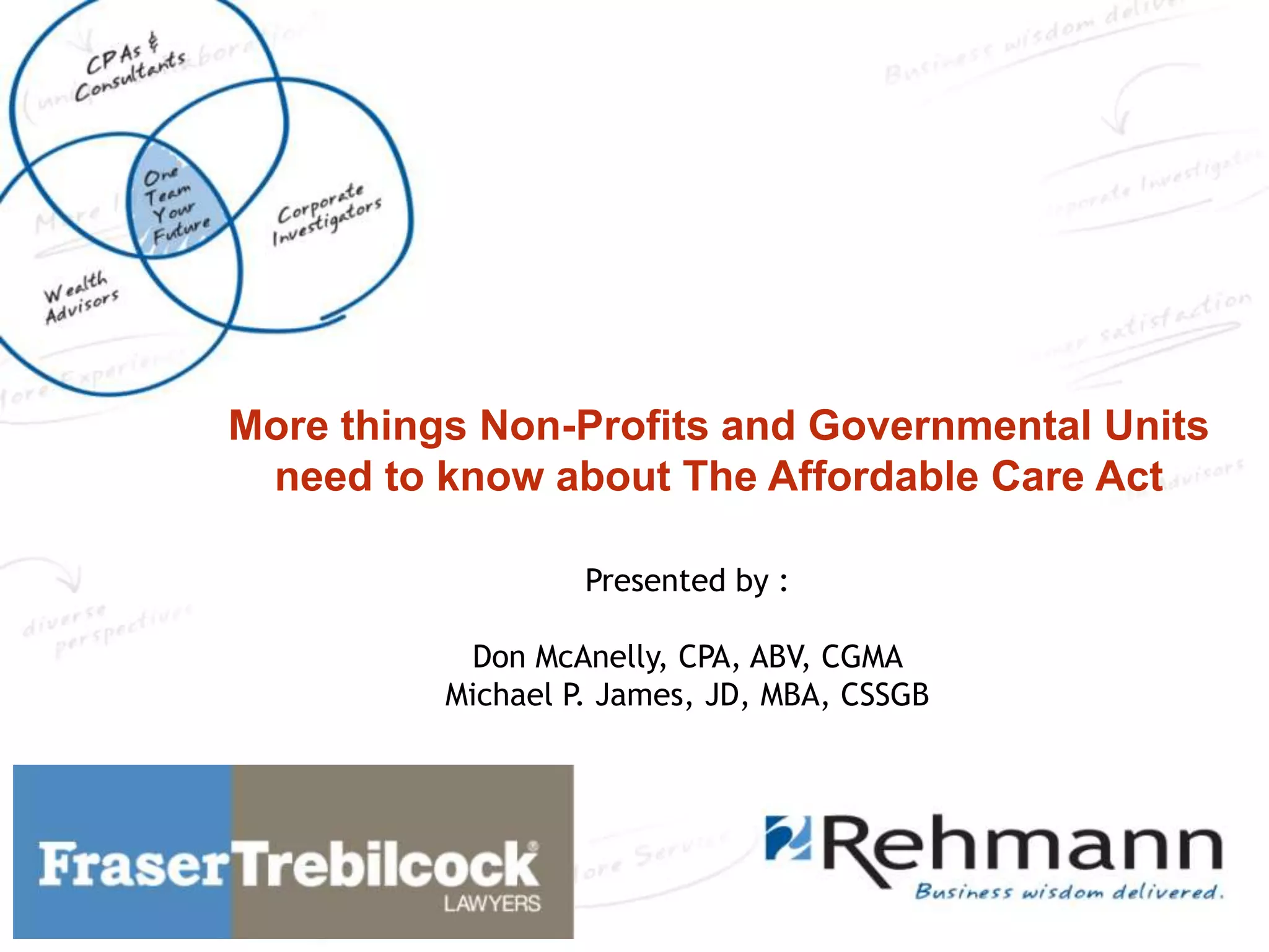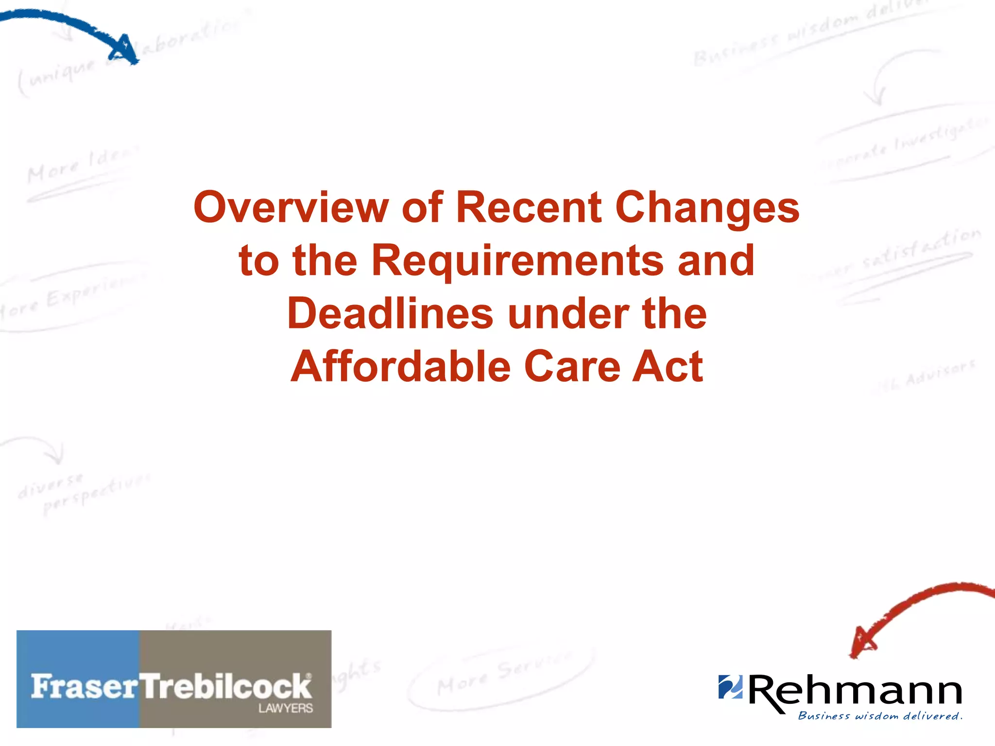 The document outlines recent changes to the Affordable Care Act (ACA), focusing on employer responsibility requirements and updated classifications for full-time employees. Modifications include delayed penalties for large employers, revised definitions for seasonal employees, and exemptions for certain types of workers. It highlights significant deadlines and compliance requirements crucial for non-profits and governmental units, as well as the tax implications of ACA provisions.