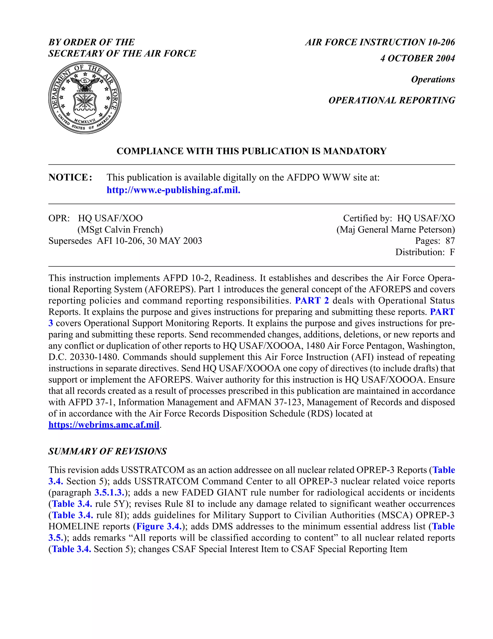 This document provides guidance and instructions for the Air Force Operational Reporting System (AFOREPS). It establishes reporting policies, outlines command reporting responsibilities, and describes various operational reports including OPREP-3 Event/Incident reports, Commander's Situation Reports, and others. The instruction standardizes reporting formats and procedures to ensure timely and accurate operational information is provided up the chain of command.
