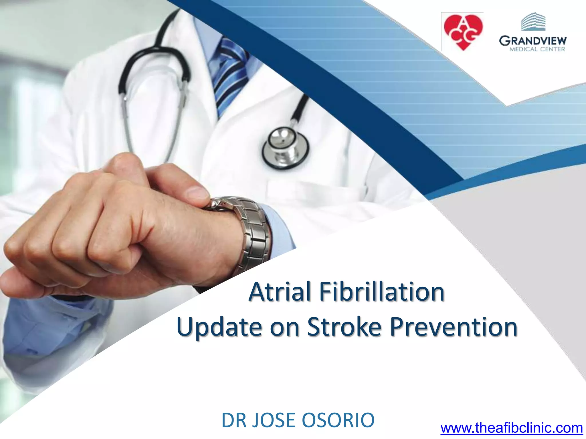 3) It also discusses left atrial appendage closure with the Watchman device as an alternative for stroke prevention in patients who cannot tolerate long-term anticoagulation. The Watchman trials demonstrated the device's safety and efficacy in reducing stroke risk comparable to warfarin.