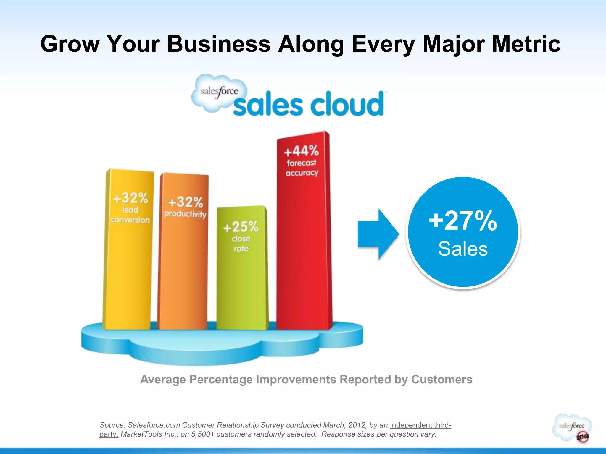 Salesforce is a cloud-based customer relationship management platform that can help grow sales along major metrics. It allows tracking of every customer interaction, selling from any device, turning more opportunities into closed business, accurate forecasting, real-time dashboards, and analytics insights. Customers report average improvements of 27% in sales, 32% in lead conversion and pipeline growth, and 44% in forecast accuracy.