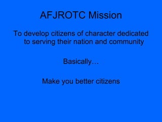 The document introduces the mission and activities of AFJROTC TX-20011. It explains that the mission is to develop citizens of character by teaching leadership and life skills through activities like drill, first aid training, and community service. It outlines the Air Force core values of Integrity First, Service Before Self, and Excellence in All We Do. It lists some of the unit's activities, which include drill competitions, honor guard, physical training, volunteering at a nursing home, and participating in parades.