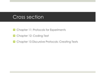 This document summarizes key aspects of experimental design and methods for coding texts from media research. It discusses the components of experimental design including causality, theory, control, and ecological validity. It also outlines different types of intentionalities to analyze in media texts, such as those of the author, text, audience, and interpreter. Finally, it provides guidance on coding texts by establishing the texts of interest, analytical approach, unit of analysis, coding scheme, and analysis.