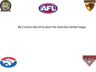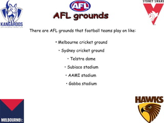 This document summarizes some key Australian rules football matches and traditions. It outlines several major AFL stadiums where teams play, including the Melbourne Cricket Ground. It also discusses annual ANZAC Day and Queen's Birthday matches between Collingwood and Essendon/Melbourne that have occurred for over 150 years. Additionally, it mentions the Dreamtime at the G match between Richmond and Essendon held each year at the MCG to celebrate Indigenous traditions.