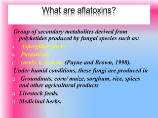 This document summarizes information about aflatoxins, which are toxic metabolites produced by certain fungi that can contaminate agricultural crops. It discusses the fungi that produce aflatoxins, including Aspergillus flavus, A. parasiticus, and rarely A. nomius. The document outlines factors that influence aflatoxin accumulation in crops and describes the four main types of aflatoxins: B1, B2, G1, and G2. It also discusses the health risks of aflatoxin exposure and methods for detecting and preventing aflatoxin contamination.
