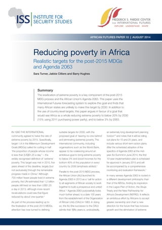 This document discusses targets for reducing extreme poverty in Africa by 2030 as part of the post-2015 MDG process and the African Union's Agenda 2063. It uses the International Futures forecasting system to analyze prospects for poverty reduction in Africa up to 2063. The analysis finds that many African states are unlikely to achieve the target of reducing extreme poverty (income below $1.25 per day) to below 3% by 2030 based on current trends. As an alternative, the document argues for targets of reducing extreme poverty in Africa to below 20% by 2030, below 10% by 2045, and below 3% by 2063. It also recommends setting additional country-level targets given differences between countries.