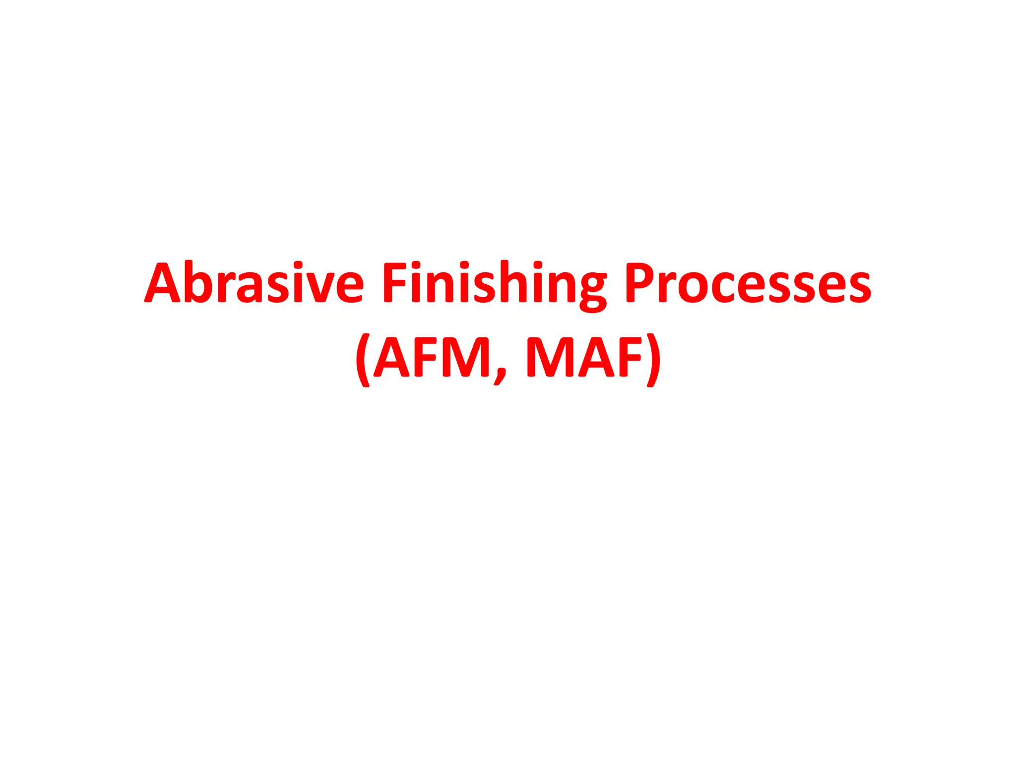 This document discusses two abrasive finishing processes: abrasive flow machining (AFM) and magnetic abrasive finishing (MAF). AFM involves extruding an abrasive-laden putty between a workpiece and tooling to remove material, allowing for burr removal, radiusing, and polishing of complex shapes. MAF uses magnetic iron particles coated with abrasive grains to polish rod and flat surfaces. Both processes allow for close tolerances, intricate surface features, and machining of hard materials with minimal material removal due to thin chip formation.