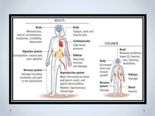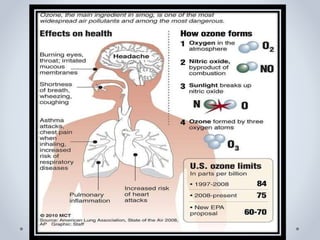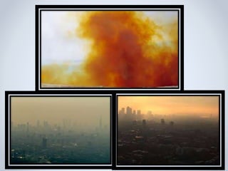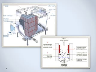 This document discusses air pollution and methods for controlling it. It defines air pollution and lists its major sources such as stationary sources, mobile sources, agricultural sources, and natural sources. It also describes the six criteria air pollutants - carbon monoxide, lead, nitrogen dioxide, ozone, particulate matter, and sulfur dioxide - and their health effects. Finally, it outlines techniques for controlling particulate matter from stationary sources, including settling chambers, cyclones, venturi scrubbers, fabric filters, and electrostatic precipitators.