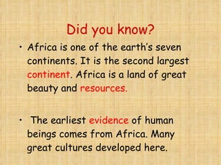 1) Ghana was a powerful kingdom located in West Africa between 1000-1100 AD that grew rich through trade along rivers and taxing traders.
