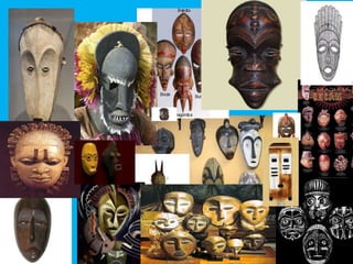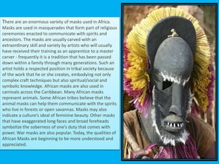 African masks are used in religious ceremonies and masquerades to communicate with spirits and ancestors. They are carefully carved by skilled artists, often trained as apprentices, who hold respected positions for embodying complex craft and symbolic knowledge passed down through generations. Masks can represent animals to help communication with forest or savanna spirits, indicate ideals of beauty, symbolize duty with power, or be used in war and Caribbean carnivals. Today, the qualities of African masks are becoming more understood and appreciated.