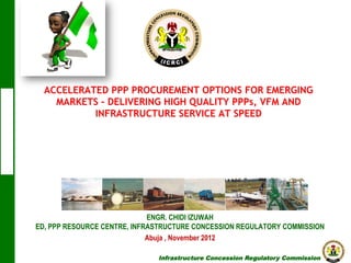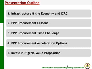 The document discusses options for accelerating public-private partnership (PPP) procurement in emerging markets to deliver infrastructure projects faster while maintaining quality and value for money. It notes that the typical PPP project development cycle takes 2-3 years, posing a challenge given political pressures to deliver infrastructure quickly. Various acceleration options are presented, including standardized processes, pre-qualified consultants, model contracts, and annuity concession models that reduce revenue risk for private partners. The goal is to reduce timelines by 50% while increasing value and capacity through PPPs.