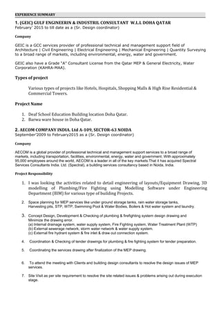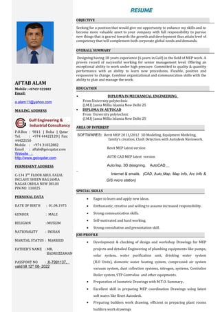 Aftab Alam provides his contact information and personal details, including his address in Qatar, permanent address in India, date of birth, and passport information. He has over 18 years of experience in MEP design and holds diplomas in mechanical engineering and AutoCAD. His objective is to enhance his skills and become a valuable asset to companies. He has worked on various projects in Qatar, India, Dubai, Saudi Arabia, and Singapore for companies including GEIC, AECOM, and ADCC-JV. His roles have included MEP coordination, equipment design, and developing workshop drawings. He is proficient in Revit MEP, AutoCAD MEP, and other software.