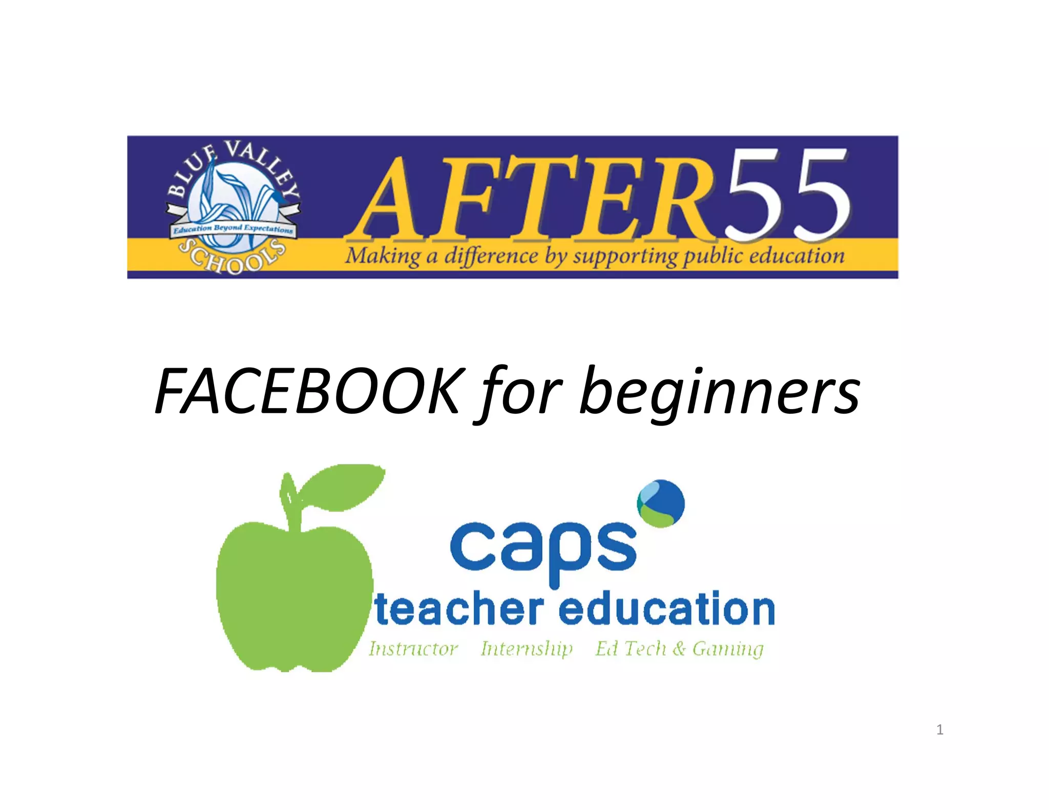 This document provides an overview of the key features and terminology for beginners using Facebook. It explains how to sign up and set up your profile, privacy settings, and how to find and connect with friends. It also describes how to post updates on your timeline and friends' walls, and how to use notifications and messages to interact with your Facebook network. Common terms like friends, likes, news feed, and timeline are defined to help new users understand the basic functionality and vocabulary of the Facebook platform.