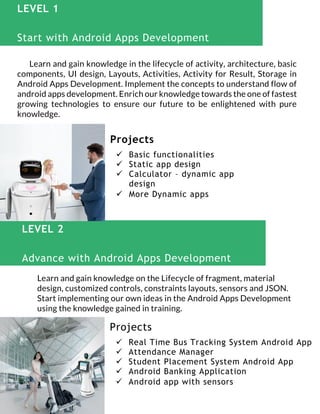 The document outlines a comprehensive Android app development training program offered by RobotixLab, covering three levels of expertise from basic concepts to advanced applications incorporating robotics. Participants will learn about activity lifecycle, UI design, and project implementation, culminating in the development of applications such as a real-time bus tracker and various specialized robots. RobotixLab has trained over 15,000 students and established integrated robotics laboratories in schools in Chennai.