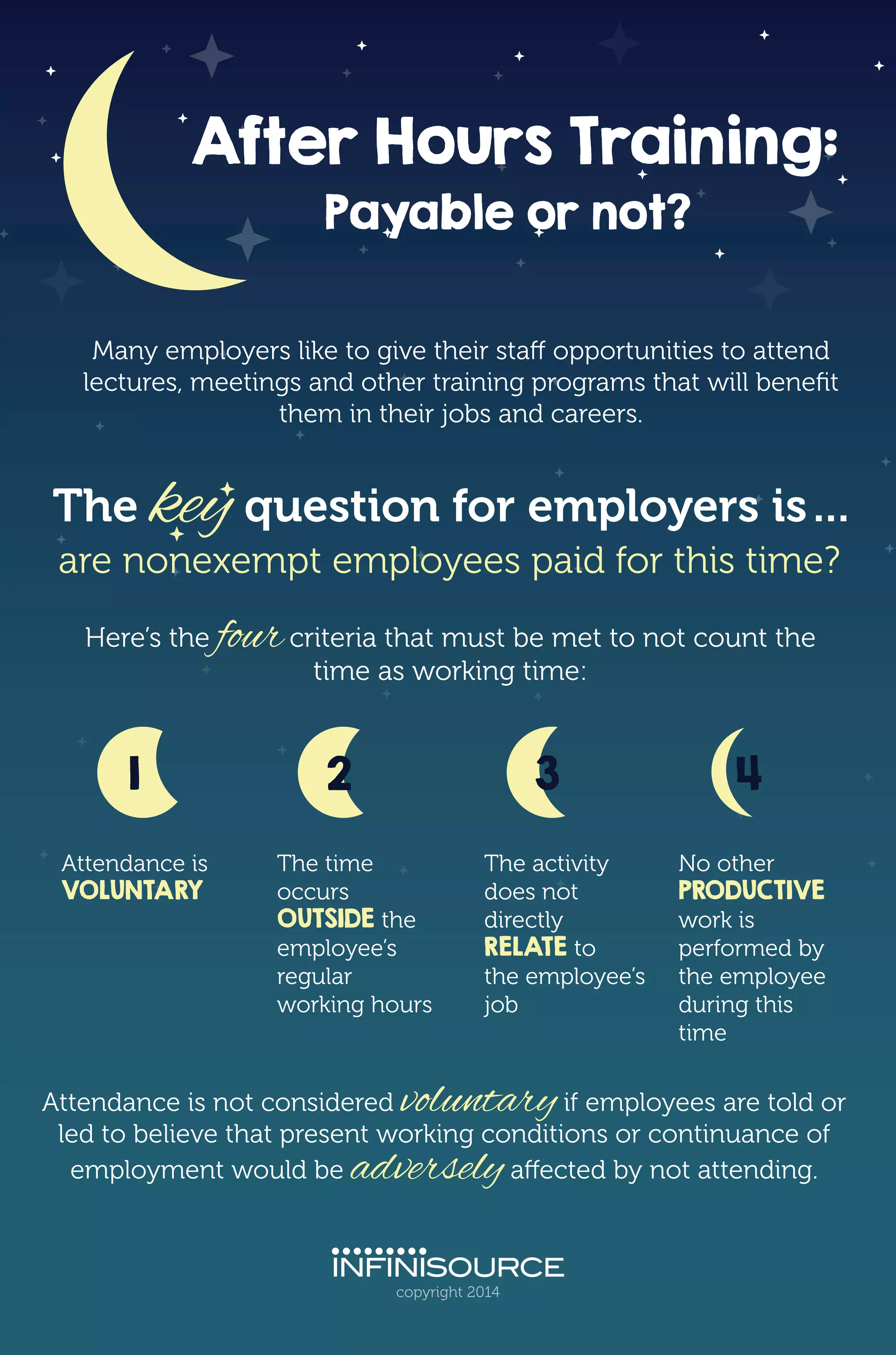 Many employers offer after hours training programs for staff to benefit their jobs and careers. For non-exempt employees, employers do not need to pay for this time if attendance is voluntary, it occurs outside regular working hours, it does not directly relate to their job, and no other productive work is performed during. However, attendance is not truly voluntary if employees feel their job would be affected by not attending.