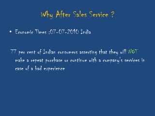 This document discusses the importance of after-sales service for companies. It notes that 77% of Indian consumers will not make a repeat purchase or continue with a company's services after a bad customer experience. Additionally, 76% of Indian consumers are willing to pay 11% more for excellent customer service. The document also outlines some key principles for after-sales service processes, including problem resolution timelines, supplier management, reporting techniques, and escalation processes. Overall, it emphasizes that quality after-sales service leads to customer satisfaction, repeat purchases, and positive word-of-mouth advertising.